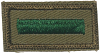 ; Khaki coarse right twill, embroidered cut edge, 1 green embroidered bar, gum back.