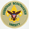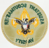 ASM11, 75mm round rolled edge, tan fine twill background, gold tenderfoot emblem with brown eagle, tan border and green lettering, plain plastic back.