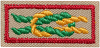 K-B10r-LO2010, beige medium right twill cloth, computer embroidery, green and orange knot, red border, plain plastic back with scout stuff logo