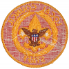 AR3B, red fine left twill cloth, gold tenderfoot emblem with brown eagle, gold border and lettering, gauze reinforced cloth back.