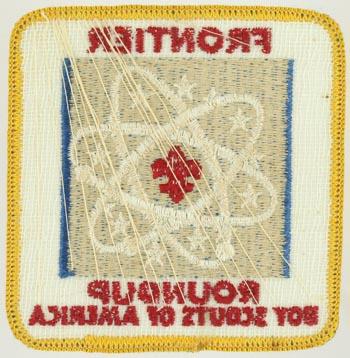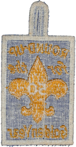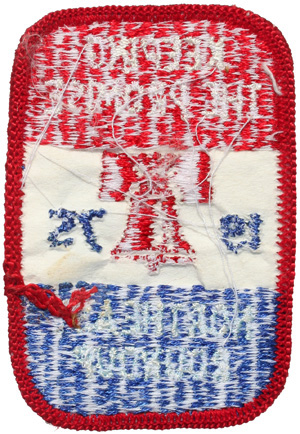 77mm x 51mm, silver Mylar border, white left fine twill cloth, plain plastic back.