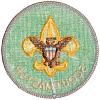 SM9-CR-grp, 75mm round rolled edge, green coarse right twill cloth, gold tenderfoot emblem with brown eagle, silver border, wreath and lettering, right twill, gauze reinforced plastic back.
