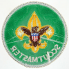 SM9-CR-pp, 75mm round rolled edge, green coarse right twill cloth, gold tenderfoot emblem with brown eagle, silver border, wreath and lettering, right twill, plain plastic back.