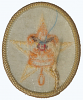 ST18-C-T-MR-MPP, cotton embroidery, tan medium right twill cloth, needle eye knot, vertically stitched star, pelon reinforced molded plastic back